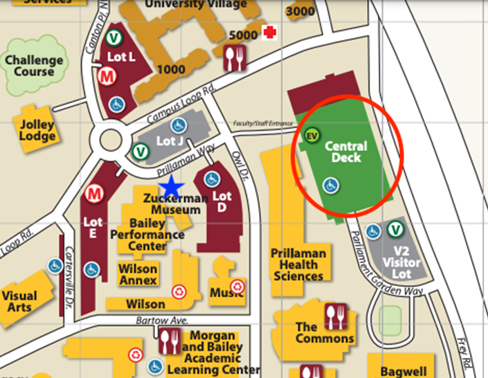 After parking in the Central Deck, please cross Owl Drive and follow the sidewalk up and around to the front entrance of the Bailey Performance Center. Do not enter the Zuckerman Museum (lower level) – that is operated separately and not to be used as a pathway to the Bailey Center.